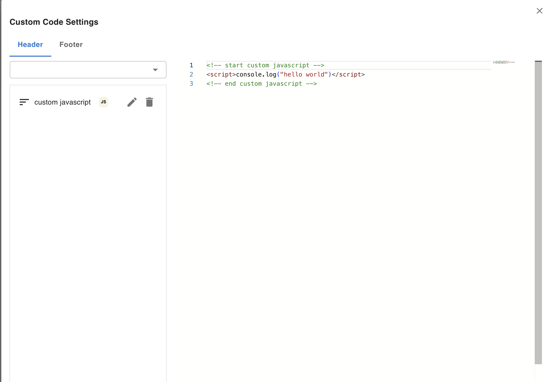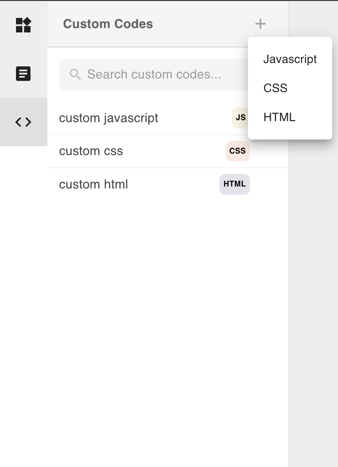 Create reusable JavaScript, HTML, or CSS code blocks. Once created, custom codes can be attached to individual templates via the footer toolbar.
