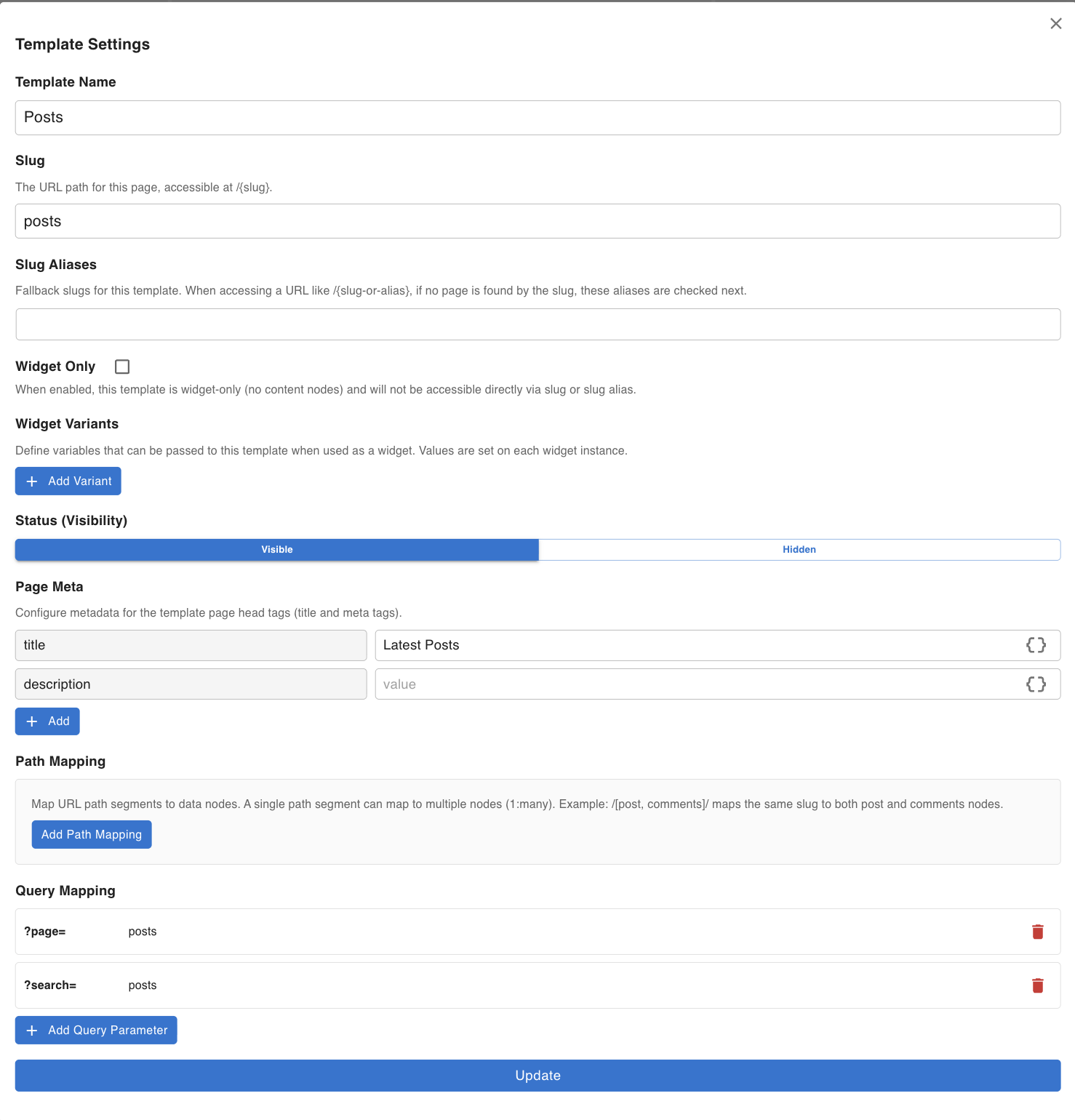 <meta>tags that are injected into the final rendered HTML for this template - Path Mapping and Query Mapping — define how URL path segments and query parameters are mapped to data fetching inputs. See Working with Dynamic Data for how to configure data fetching nodes and expose dynamic values in template content.