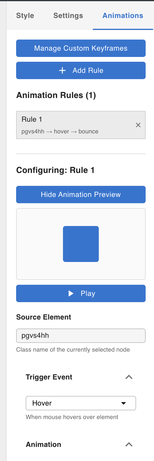 Most nodes have an Animation tab where you can attach CSS animation keyframe animations to the node.