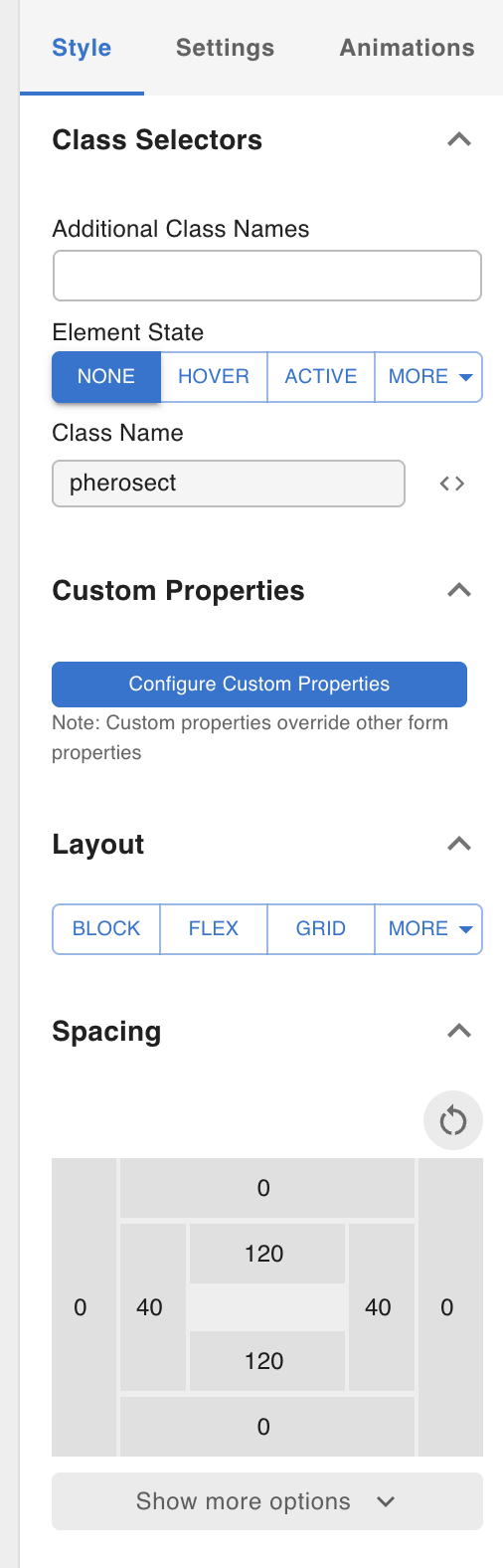 All nodes have a Styles tab where you can adjust CSS properties. Styles are device-aware: switching to a different breakpoint (mobile, tablet) in the footer toolbar lets you set per-device values, which produce the corresponding @media queries at render time.