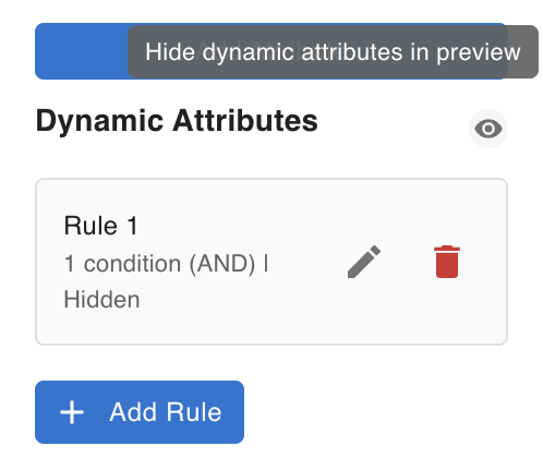 Dynamic attributes can apply conditional class names, custom HTML attributes, or display: none rules based on data conditions (e.g. "hide this element when the collection has no results"). The disable toggle suspends all rule evaluation for this node, so it renders with its base appearance regardless of what the conditions resolve to.