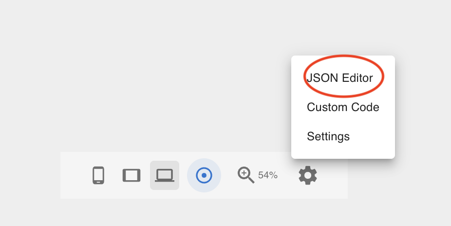 In the Footer Toolbar, click the Settings (gear) icon and select JSON Editor from the dropdown menu.