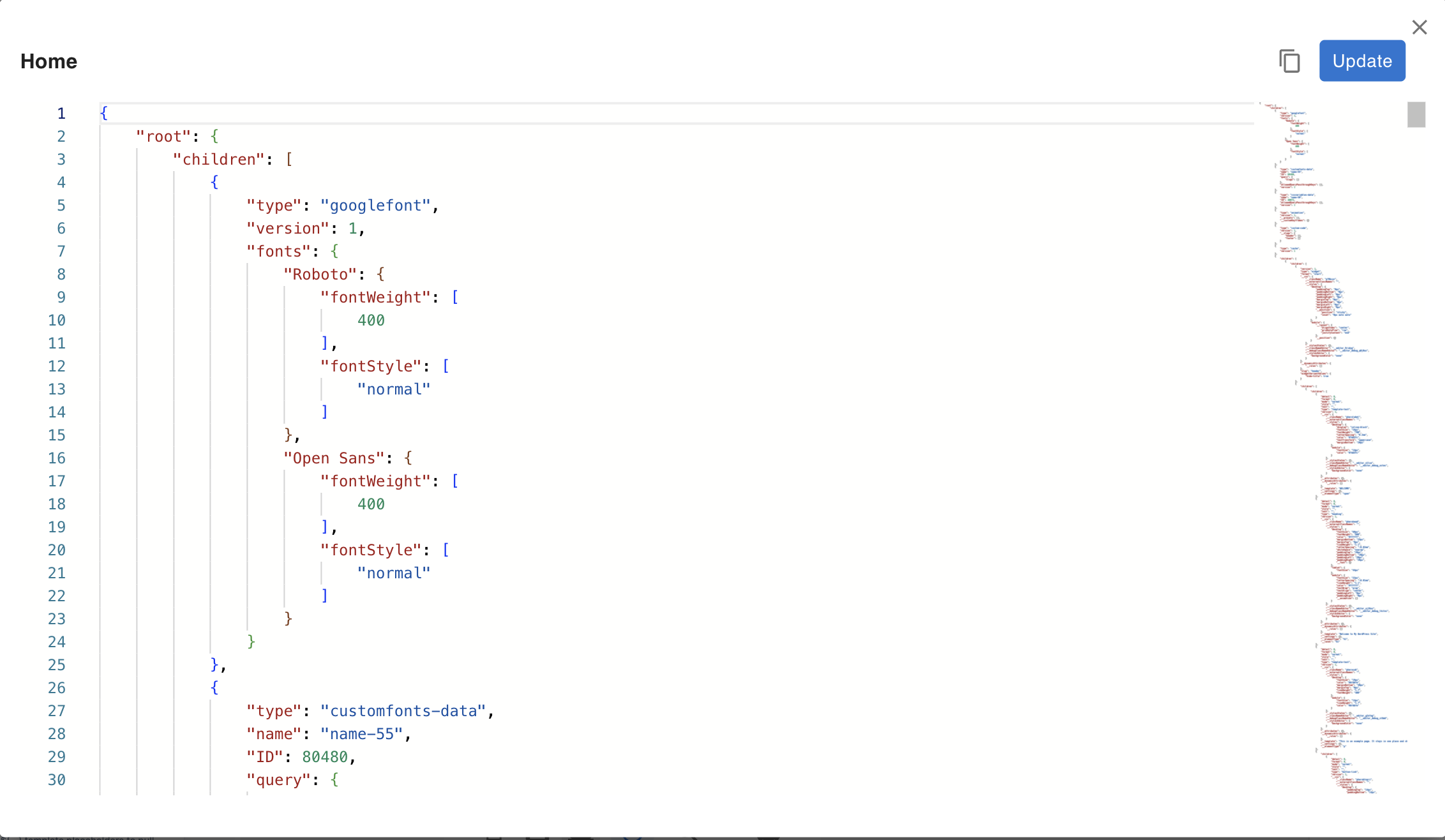 Click the copy icon in the top-right corner of the modal to copy the current JSON to the clipboard. This is useful for: