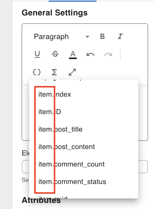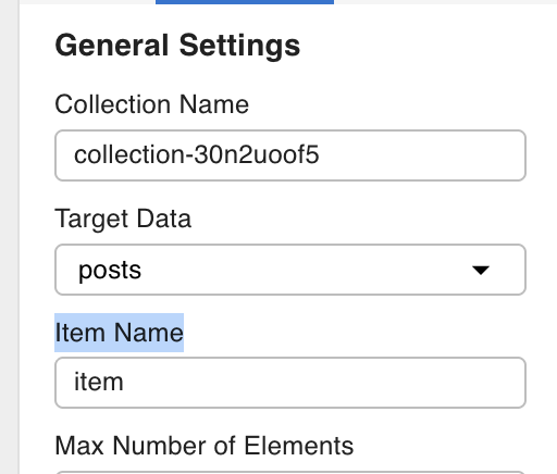 For example, if the collection is bound to a posts array data definition and Item Name is set to item, child nodes can access fields like item.ID and item.post_title: