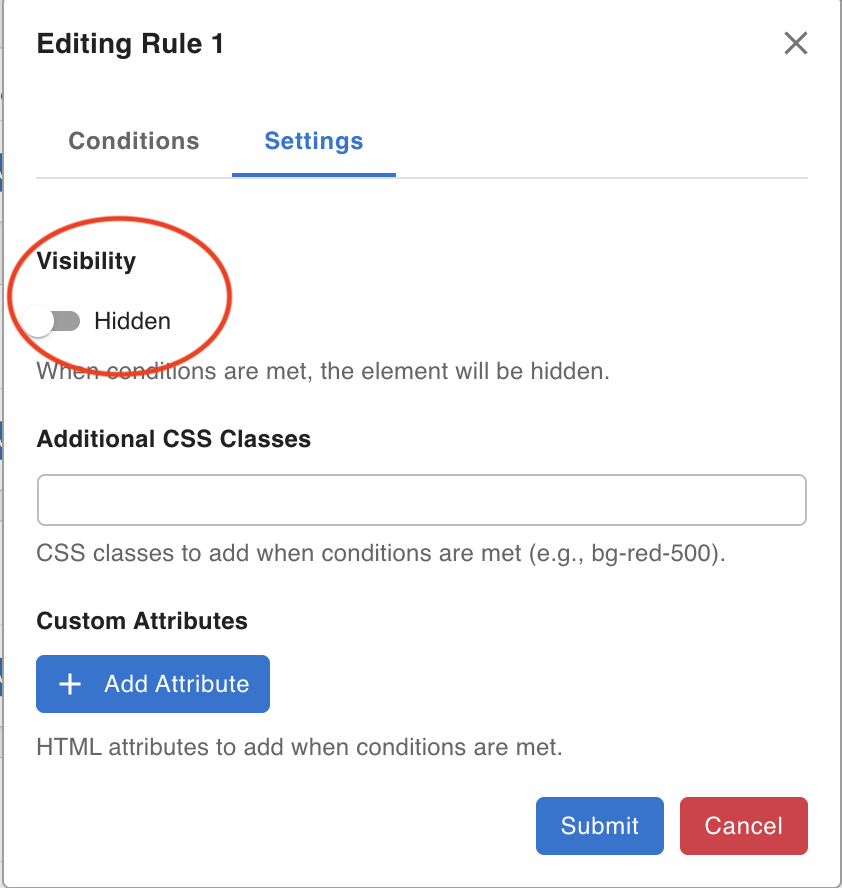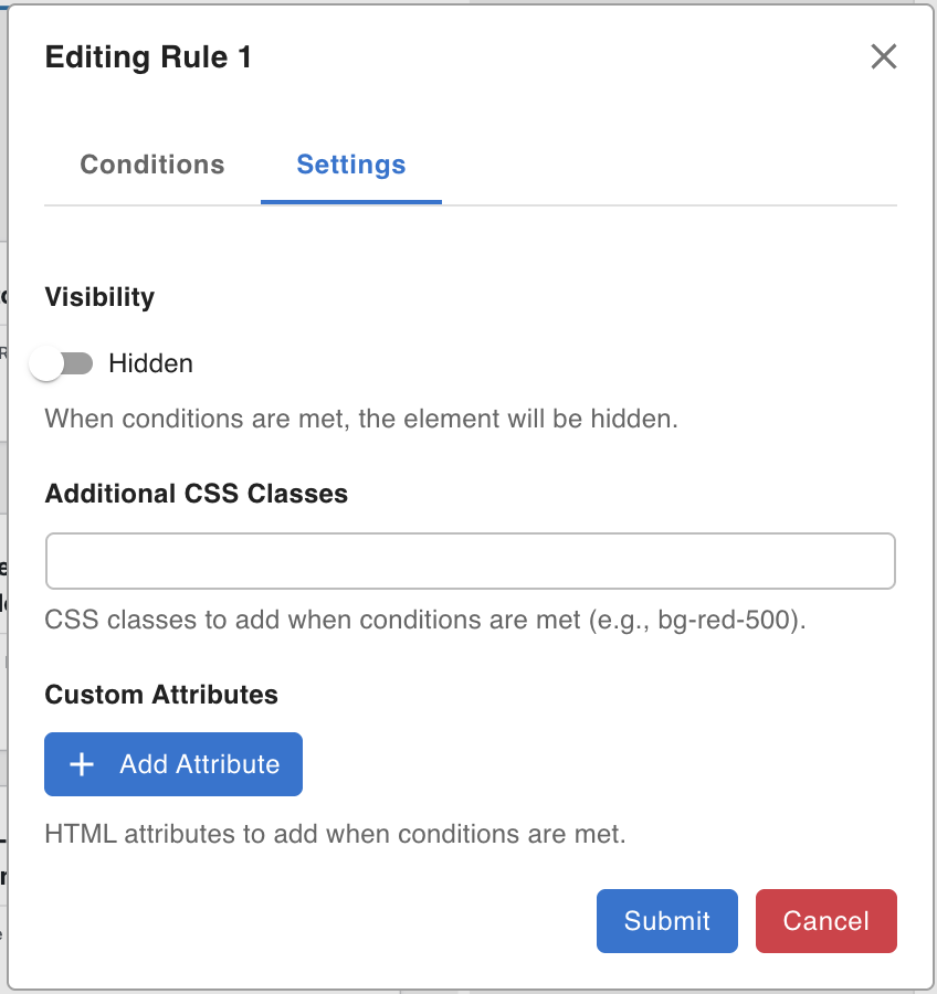 Dynamic Attributes let you conditionally modify elements based on data values — without custom JavaScript. They are configured in the Settings tab of the right panel (available on most nodes).
