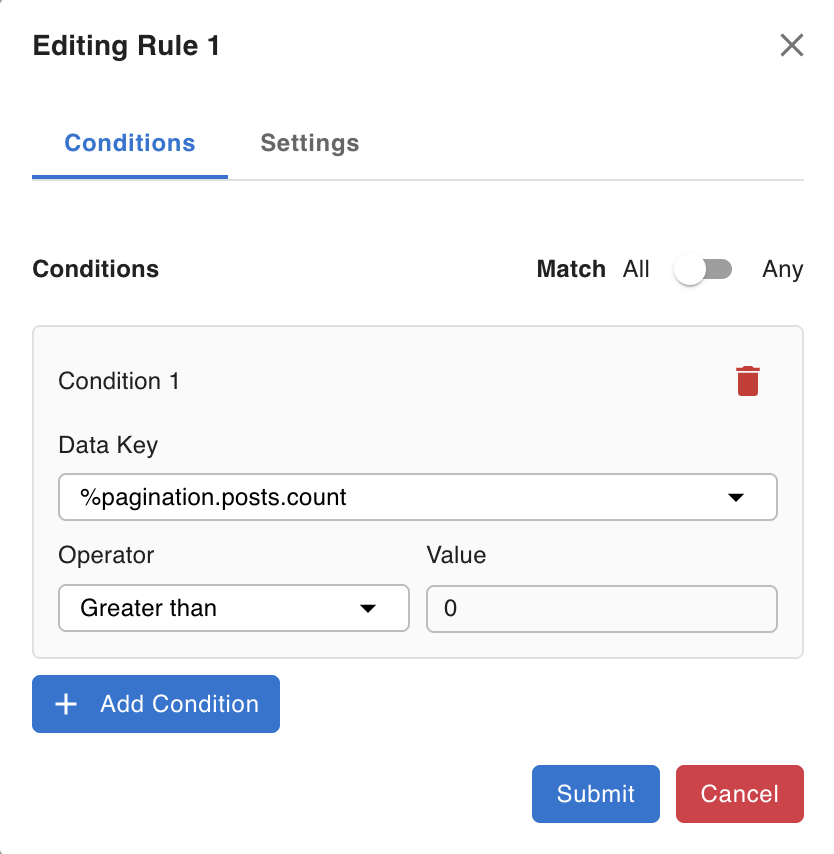 Configure a rule that checks the Pagination count field of the posts array — when count > 0, hide the "No results" element.