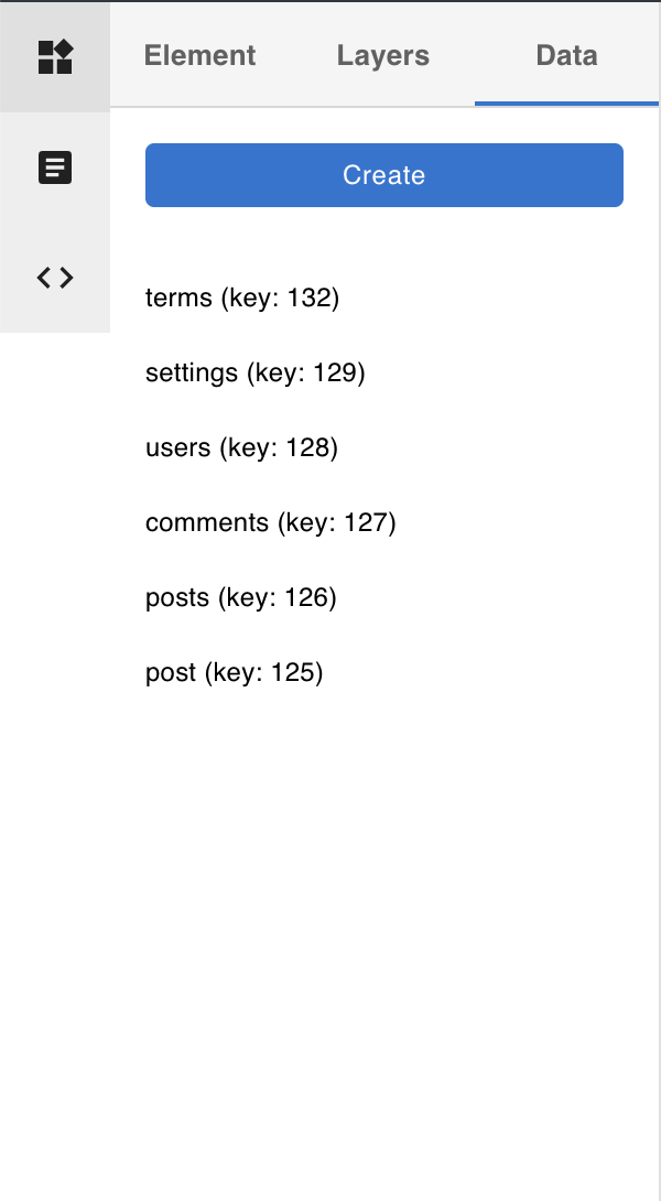 Data is defined and managed in the Data tab within the Elements panel in the left nav.