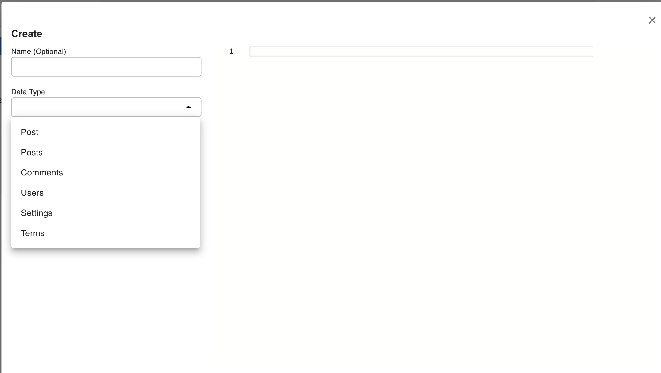 post,posts). If left blank, one is assigned automatically. The name is how you reference the data in binding expressions like${post.post_title}. - Data Type — which WordPress data to fetch. Types ending in