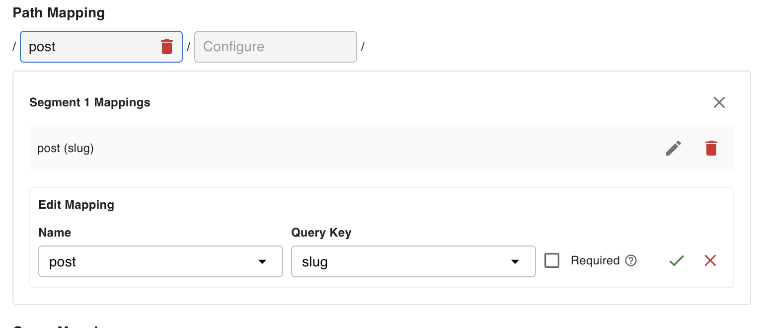 Path mapping links a URL path segment to a data key. For a URL like http://localhost/post/[slug], map the second path segment to the slug key of your Post data definition so the page fetches the post whose post_name matches the URL slug.