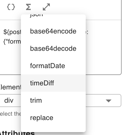 Click Σ, select a transform function (e.g. formatDate), and it appends the transformation to the binding expression: