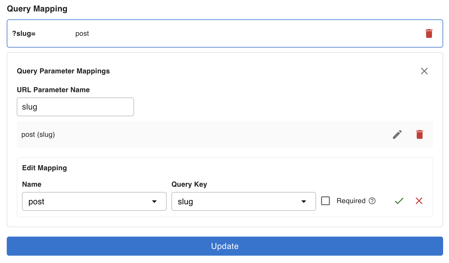Path and Query Parameter Mapping connects URL segments and query strings to data query parameters. This is what makes dynamic pages work — for example, a post detail page at /post/my-post-slug where my-post-slug drives the slug parameter on a Post data definition.