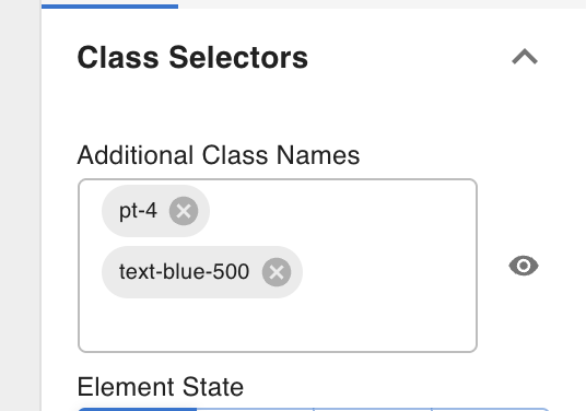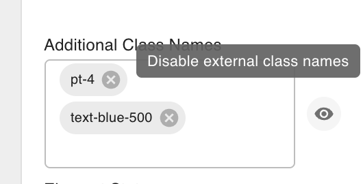 Click the eye icon next to an additional class name to temporarily disable it in the editor. The class is removed from the element's rendered output in the canvas without deleting it from the template — useful when a class is hiding or repositioning an element and you need to adjust its underlying styles.
