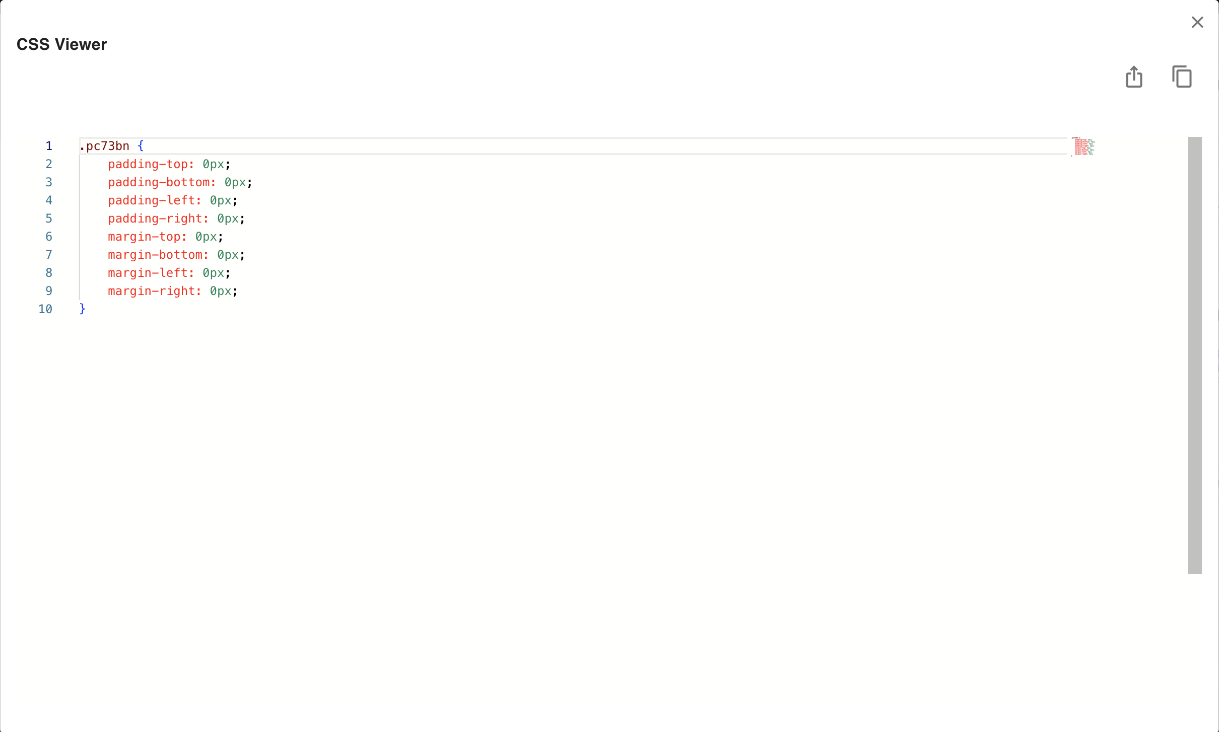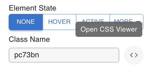 Click the code icon next to the class name input to open the CSS Viewer. This modal shows the raw CSS properties assigned to the selected node, which is useful for debugging.
