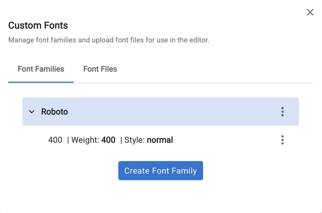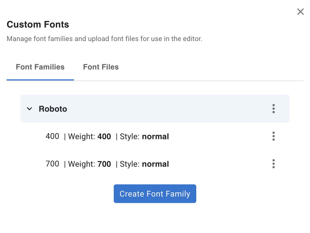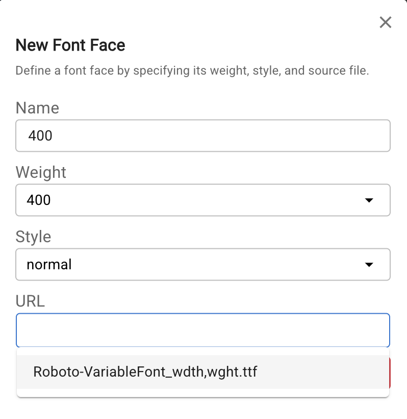 Back in the Font Family tab, click the three-dots icon on a font family and select Create Font Face. Fill in the weight, style, and select the uploaded file from the URL dropdown.