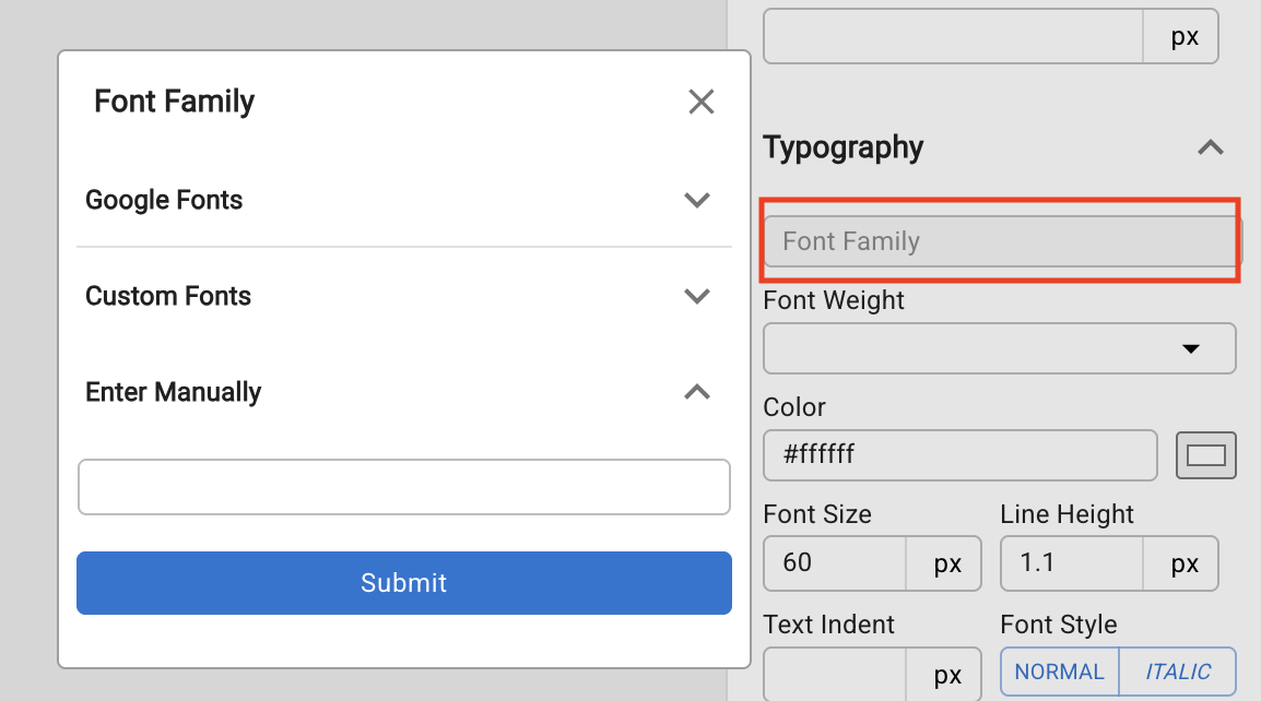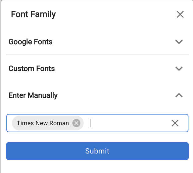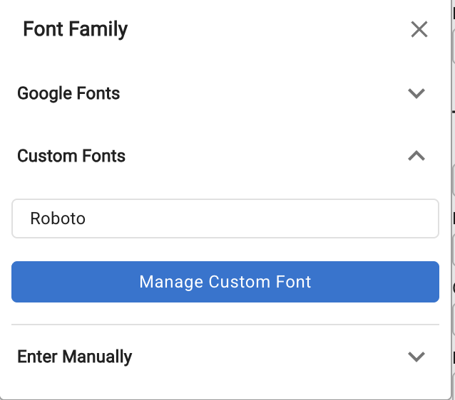 For system fonts (e.g. Times New Roman, Georgia) or fonts already loaded via a Custom Code <style> tag or external URL, use Enter Manually to type the font-family value directly.