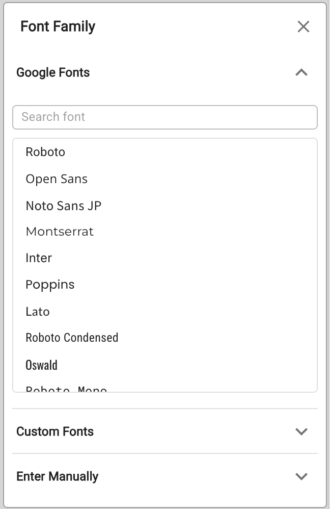 Select from a curated list of Google Fonts presets. Choosing one automatically loads the font from Google's CDN — no Custom Code entry needed.