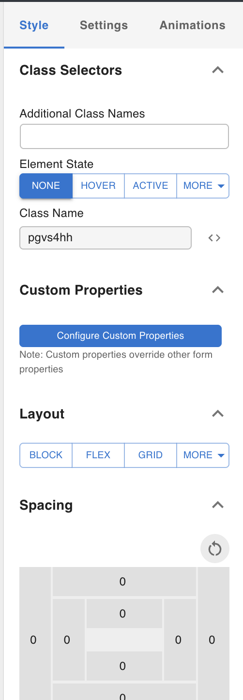 Custom Properties have lower precedence than the standard control panel values. If the same property is set both through the controls and through Custom Properties, the Custom Properties value wins — because Custom Properties writes directly into the CSS block at the same specificity level but appears after the generated styles.