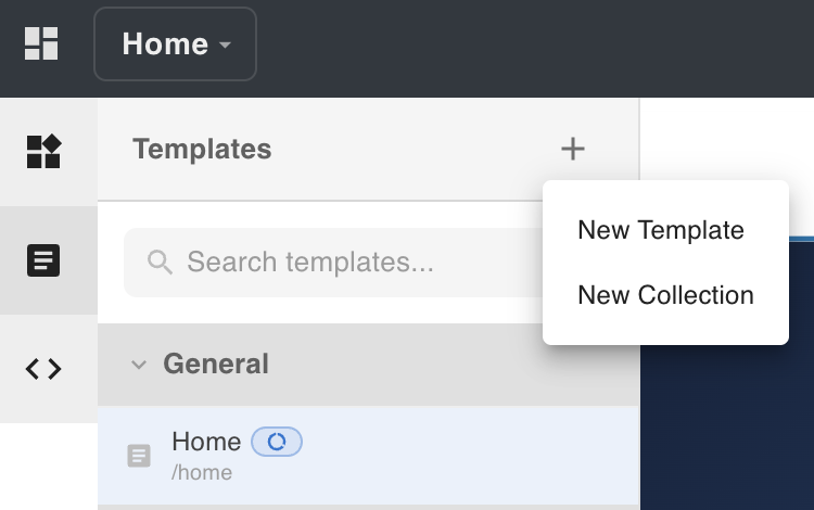 http://[domain]/[slug]. If left blank, a slug is generated automatically from the template name. The slug can be changed at any time in Template Settings. - Collection — the collection to place the template in. Collections let you group related templates in the left nav. See Canvas for how to manage collections (create, rename, delete).