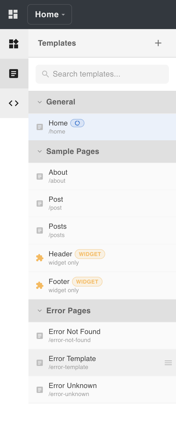 After initialization, a set of preset templates is automatically created in the editor. These cover the most common page types: