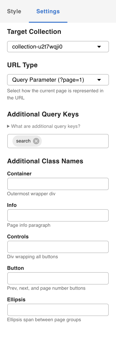 By default, the elements wrapped inside the Pagination Node have no applied styles. Use this field to assign CSS class names to the pagination wrapper so you can style it via the Styles system.