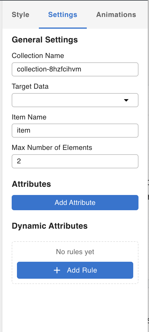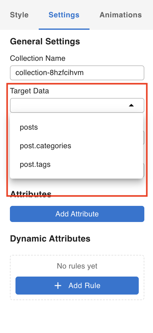 A dropdown listing any array-type Data Fetching Nodes present in the template. Select the data source you want this collection to iterate over.