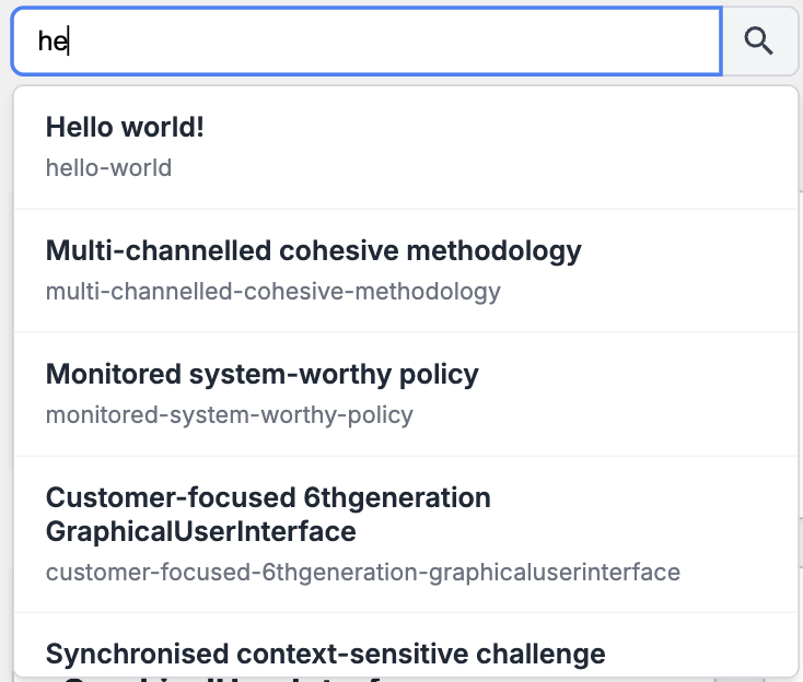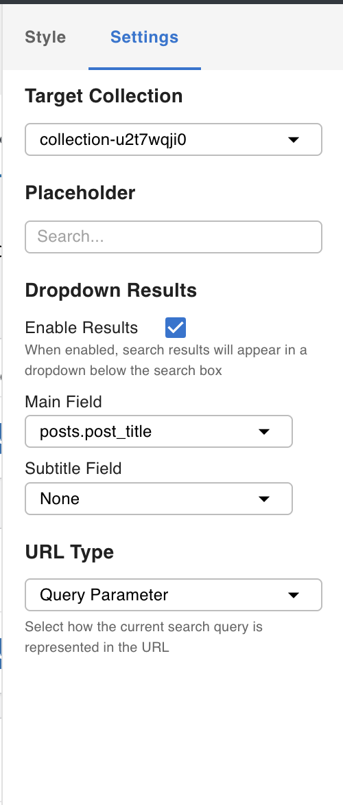 When enabled, the search box displays a quick-results dropdown as the user types — before they submit. You can configure which fields from the data source appear as the main title and subtitle in each dropdown result row.