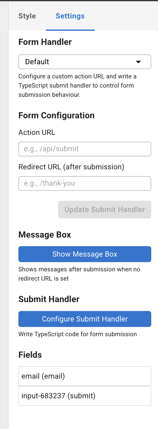 Click Update Submit Handler after editing code or changing the Action/Redirect URLs — this recompiles the TypeScript and regenerates the minified JavaScript that runs in the browser.